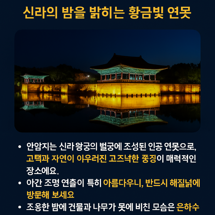 안압지는 신라 왕들의 별궁으로, 밤에 방문하면 물에 비친 고즈넉한 건축물과 연못의 조화가 정말 아름다워요. 동궁과 월지는 야경이 환상적이라 사진 촬영 명소로 인기가 많답니다. 연꽃이 피는 여름에 가면 더욱 멋진 풍경을 볼 수 있어요.