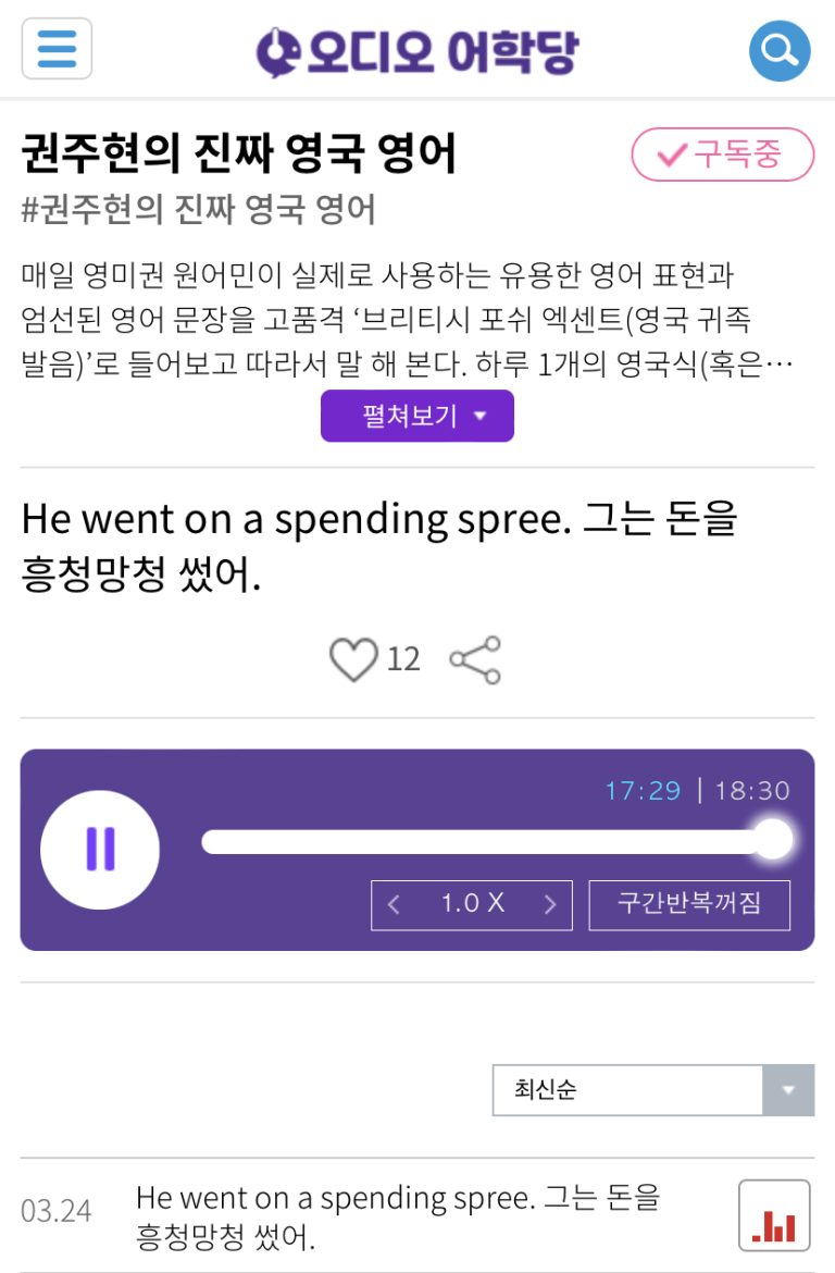 Today is Wednesday, the 24th of March.happy hump day!Listeners!Repeat these sentences to yourself every single day.Increase your chances of success.I can do it. I’ve rocketed. I am the best. *spree 흥청망청하기/흥청망청버리기*spending spree 흥청망청 돈을 쓰다.*shopping spree 흥청망청 쇼핑*drinking spree 흥청망청 마시는 술 A: He went on a spending spree with...