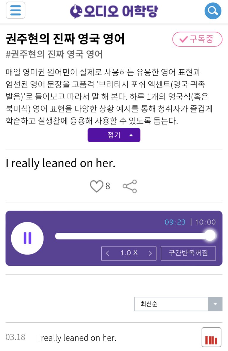 20.03.18.수 I really leaned on her. 나 정말 그녀에게 의지했어. 권주현의 진짜 영국 영어