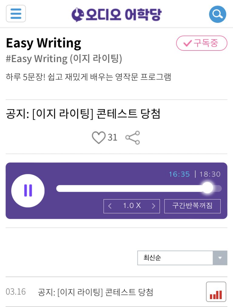 21.03.16.화 Easy Writing 공지: [이지 라이팅] 콘테스트 당첨 Keep up the good work. 계속 잘 해 주세요.