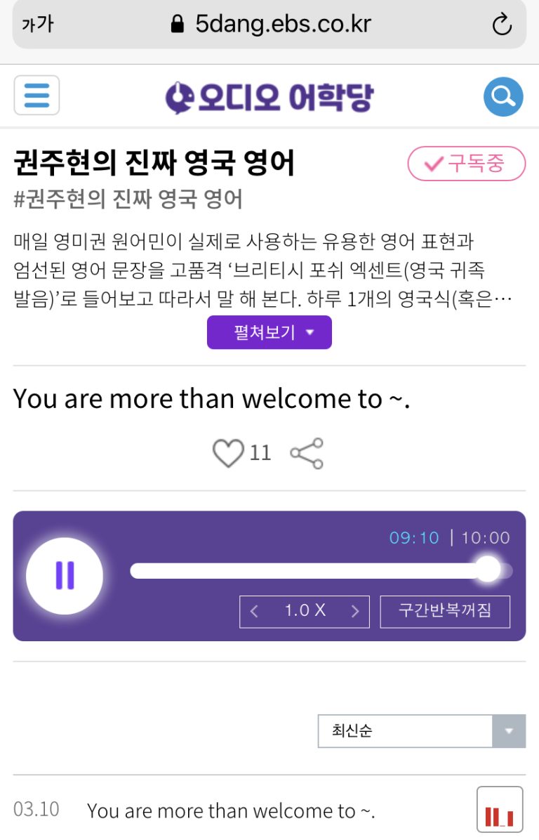 This is 권주현의 진짜 영국 영어 on EBS radio.The program you can learn British accent with me.Today is Tuesday the 10th of March, a perfect day to study and it’s time to hit the books.Learn posh accent with me and read out loud so that you can speak English with...